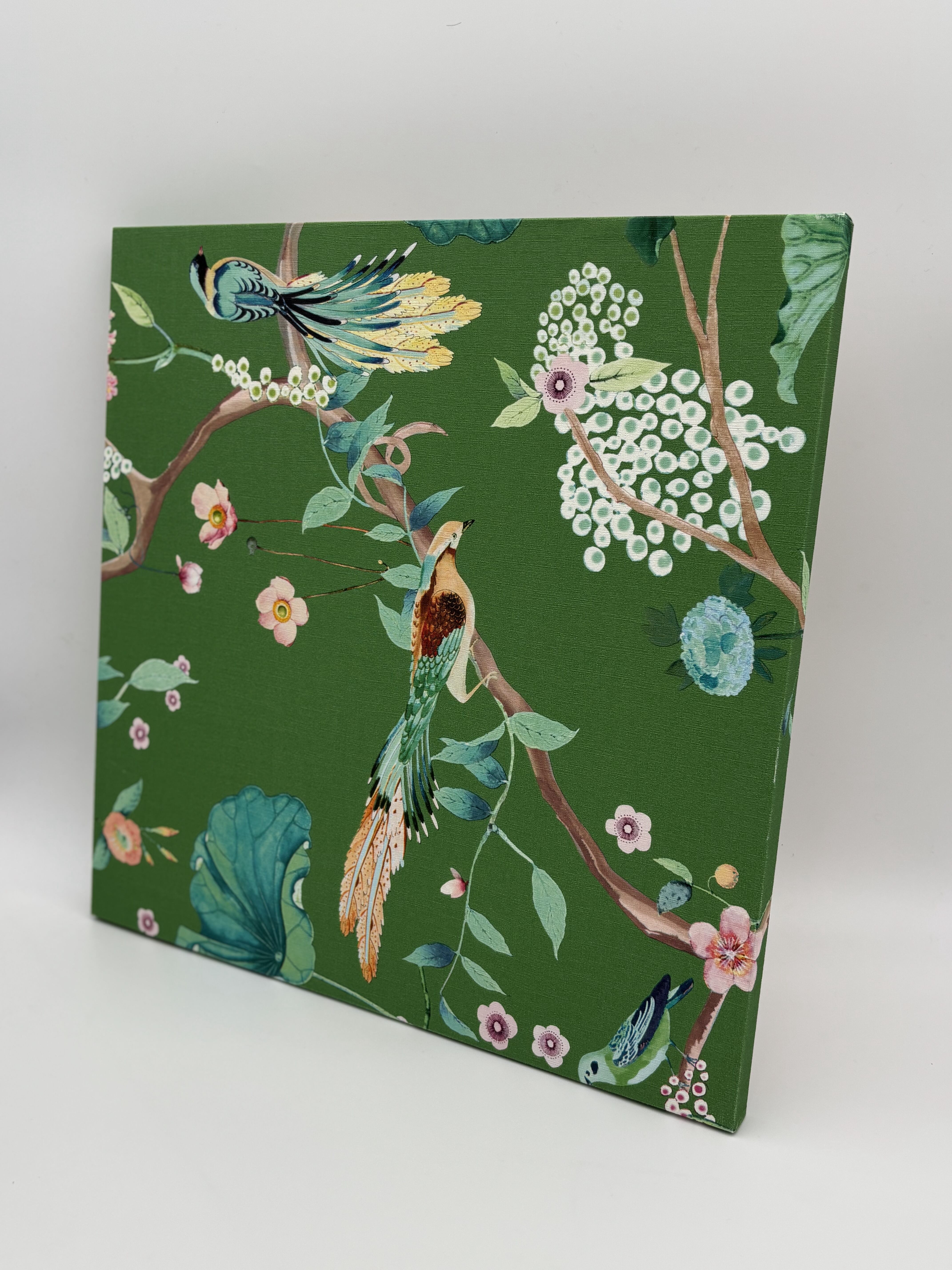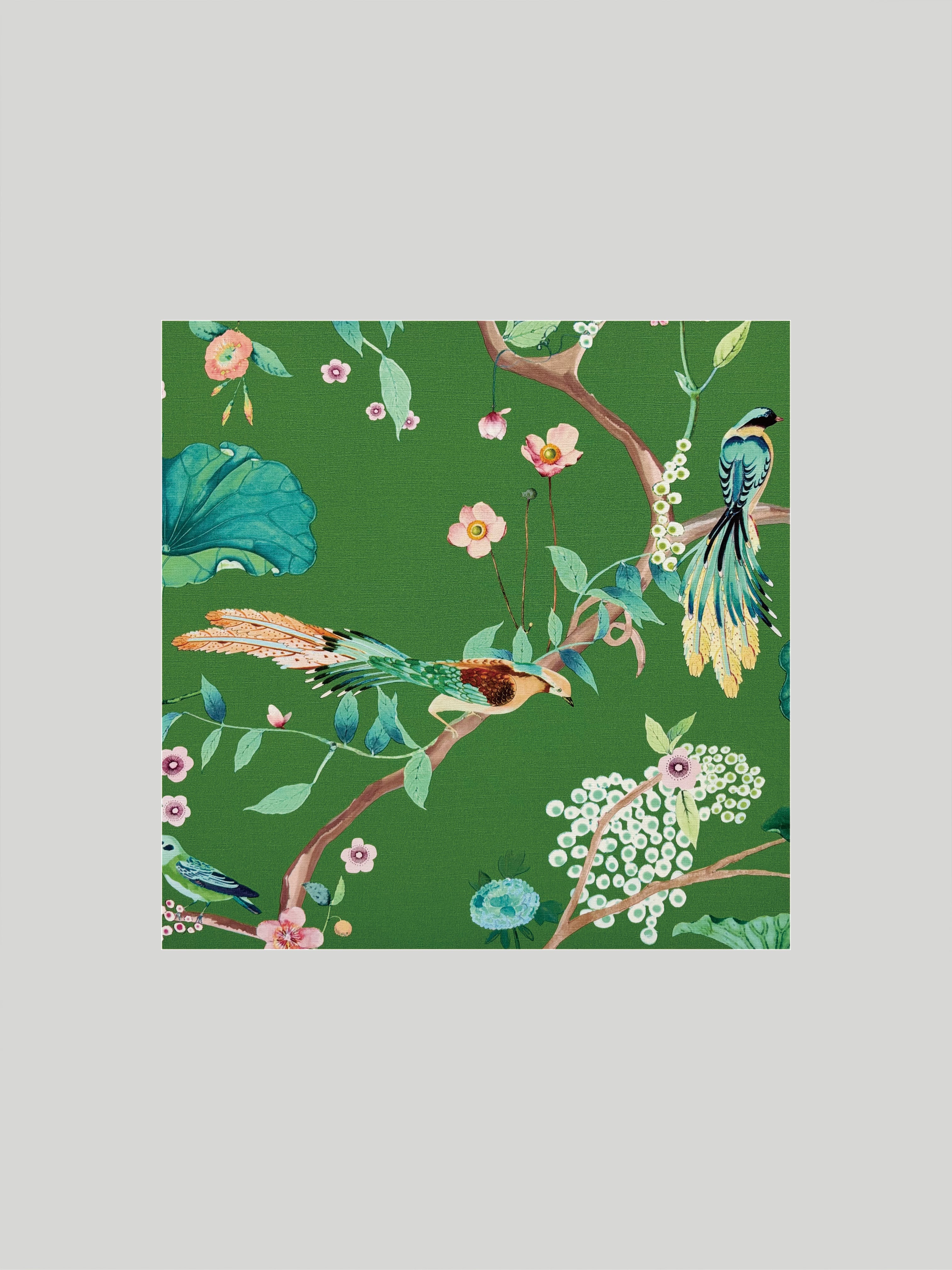 枝いっぱいに咲き誇る花々と、静かに佇む鳥たちを描いたデザイン。