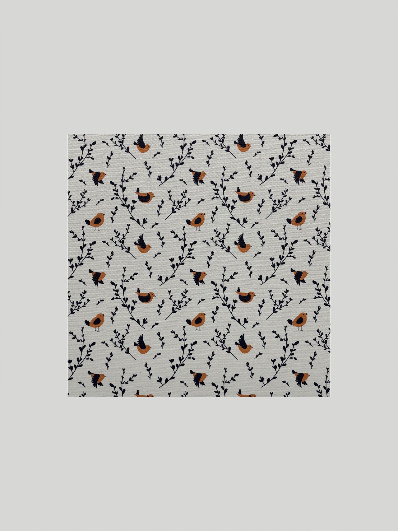 枝にとまる小鳥たちを、軽やかなタッチで描いた春らしいデザイン